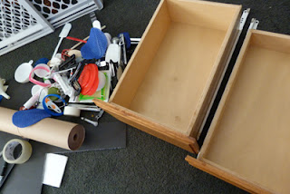 This is what the junk drawer & a couple of the kitchen drawers looked like before I started, having already reduced their size a couple weeks ago. I got rid of about 1/3 of what was in there.